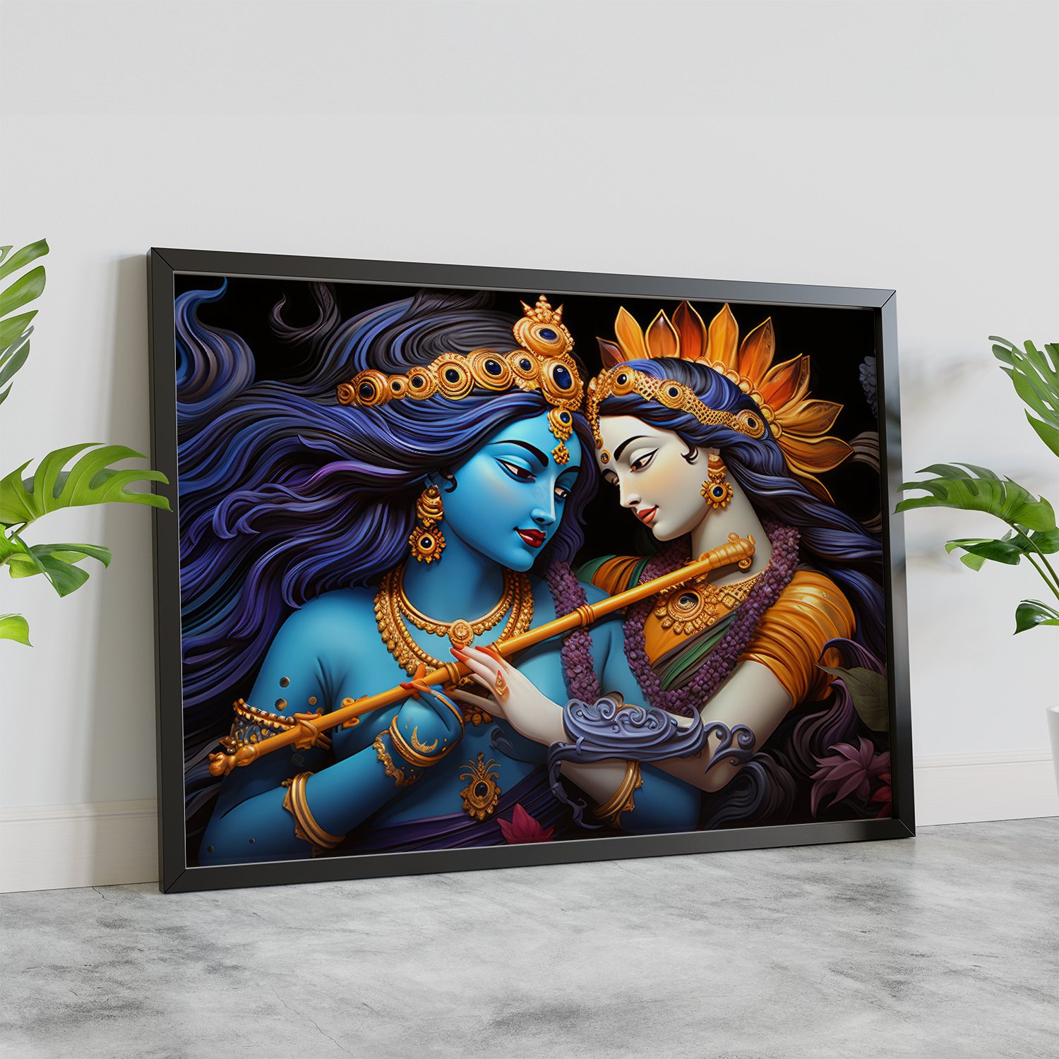 - White Frame: Embrace the purity and simplicity of divine love with our Lord Radha Krishna wall art framed in pristine white. The clean lines of the frame create a sense of purity and serenity, perfectly complementing the ethereal beauty of the artwork.