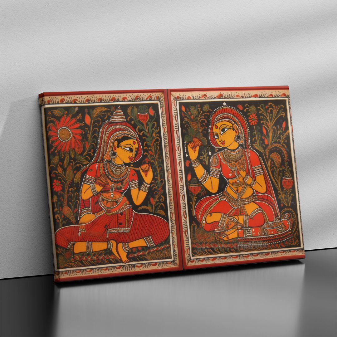 Acrylic wall painting of two women with the face painted in different colors for wal decoration