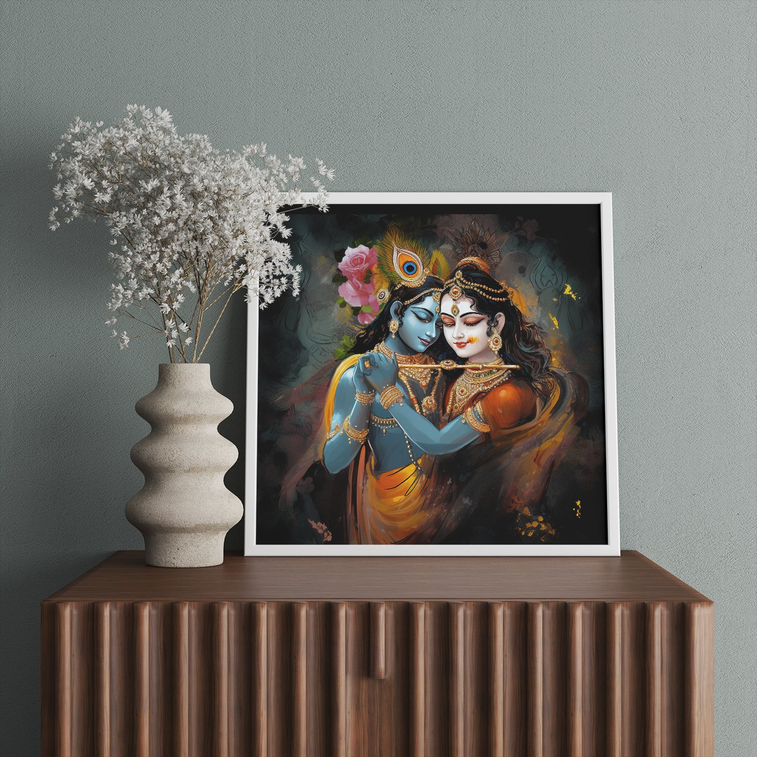 - White Frame: Embrace the purity and simplicity of divine love with our Lord Radha Krishna wall art framed in pristine white. The clean lines of the frame create a sense of purity and serenity, perfectly complementing the ethereal beauty of the artwork.