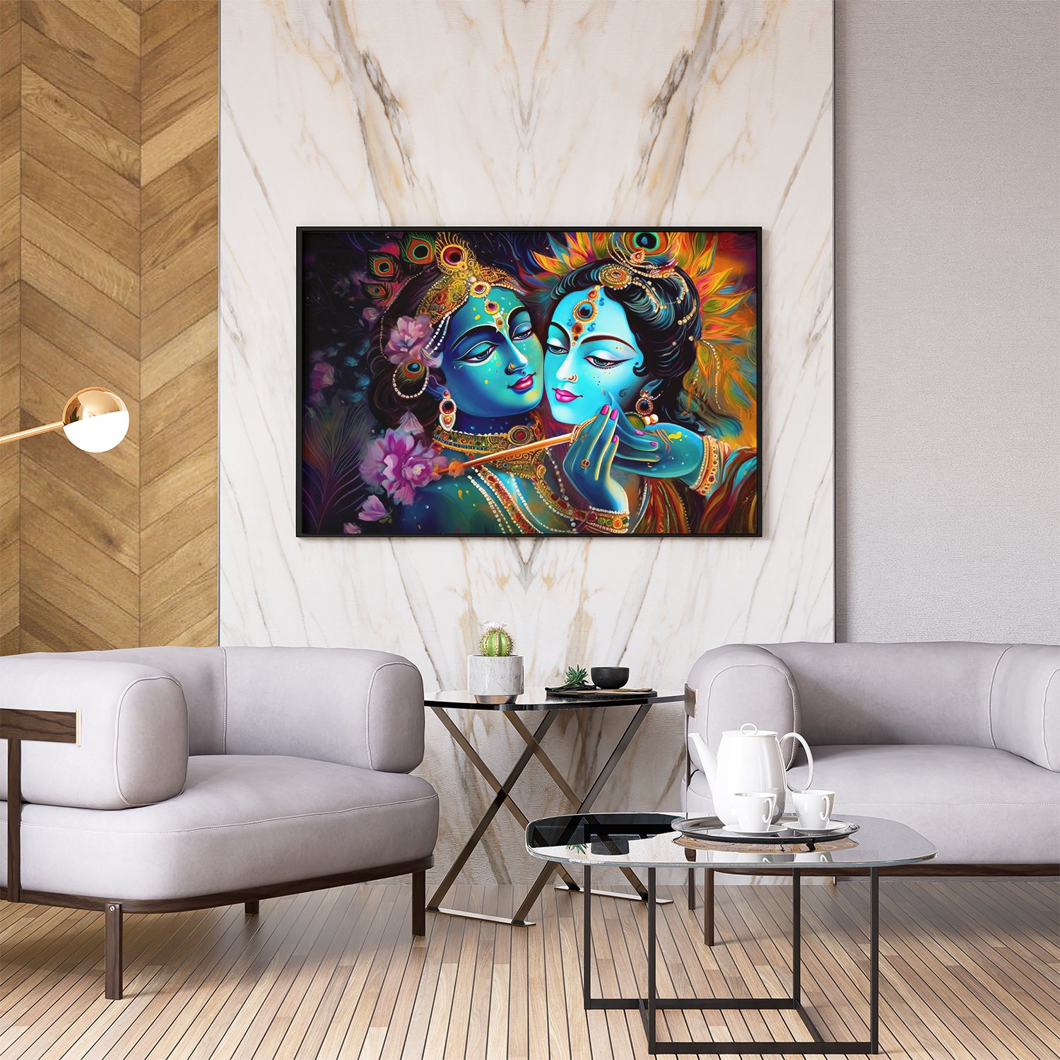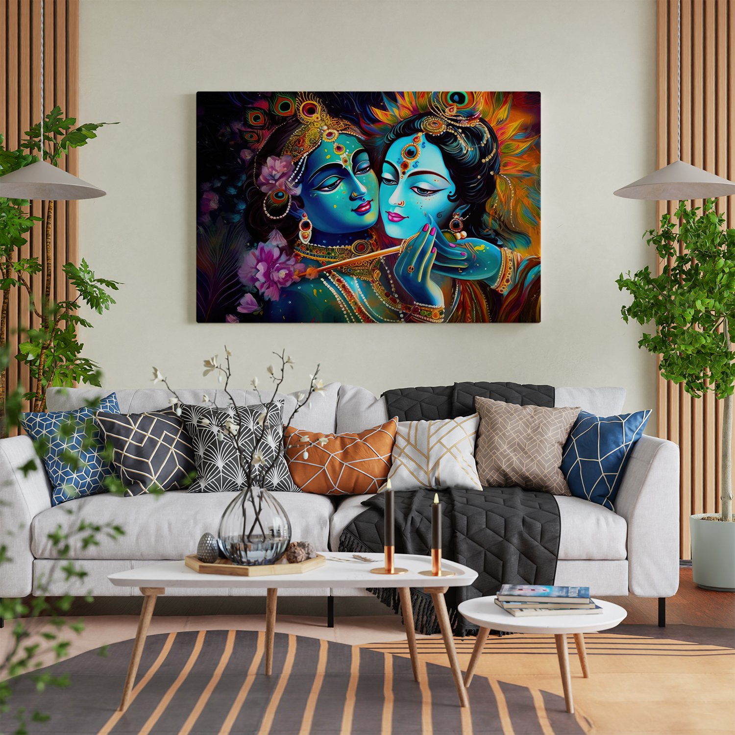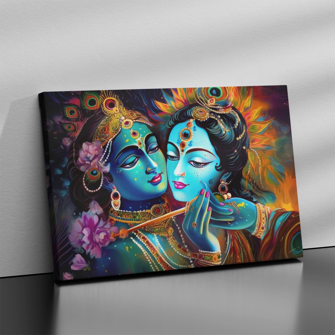 - Gallery Wrapped Stretched Canvas: Elevate your decor with a timeless masterpiece that transcends boundaries. Our Lord Radha Krishna wall art on gallery-wrapped stretched canvas offers a contemporary yet classic look, seamlessly blending into any modern or traditional setting.