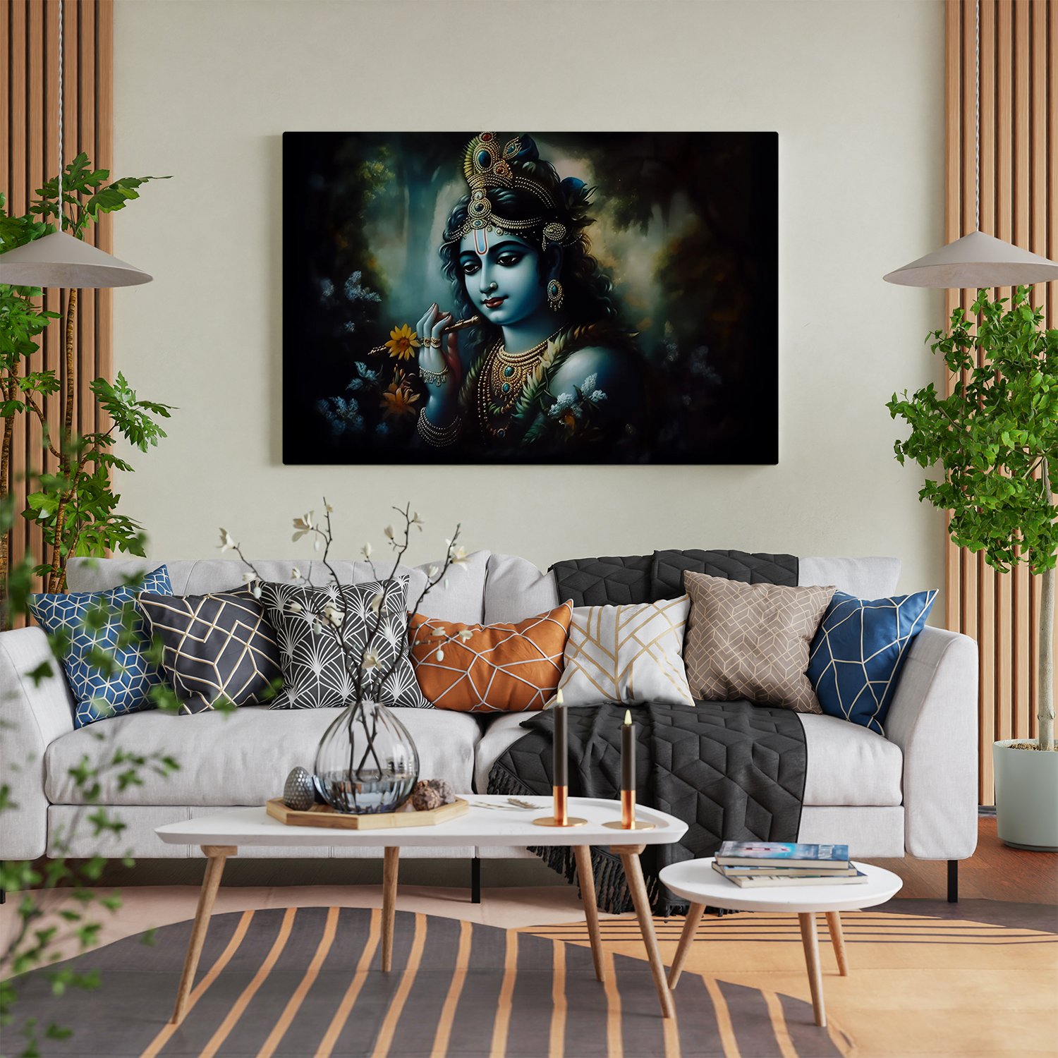 - Gallery Wrapped Stretched Canvas: Elevate your decor with a timeless masterpiece that transcends boundaries. Our Lord Radha Krishna wall art on gallery-wrapped stretched canvas offers a contemporary yet classic look, seamlessly blending into any modern or traditional setting.