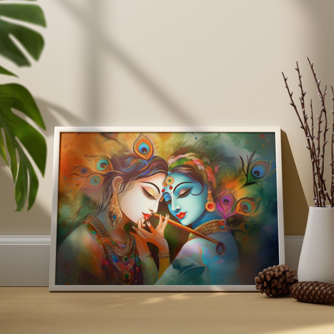 - White Frame: Embrace the purity and simplicity of divine love with our Lord Radha Krishna wall art framed in pristine white. The clean lines of the frame create a sense of purity and serenity, perfectly complementing the ethereal beauty of the artwork.