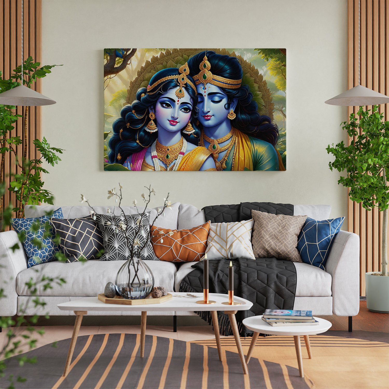 - Gallery Wrapped Stretched Canvas: Elevate your decor with a timeless masterpiece that transcends boundaries. Our Lord Radha Krishna wall art on gallery-wrapped stretched canvas offers a contemporary yet classic look, seamlessly blending into any modern or traditional setting.